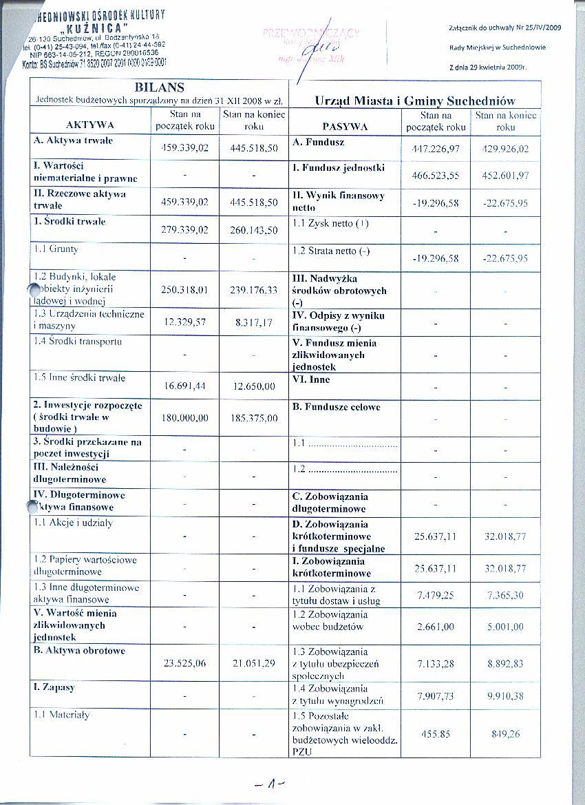 Uchwała Nr 25/IV/09 - w sprawie zatwierdzenia sprawozdania finansowego za rok 2009 Suchedniowskiego Ośrodka Kultury 'Kuźnica'0