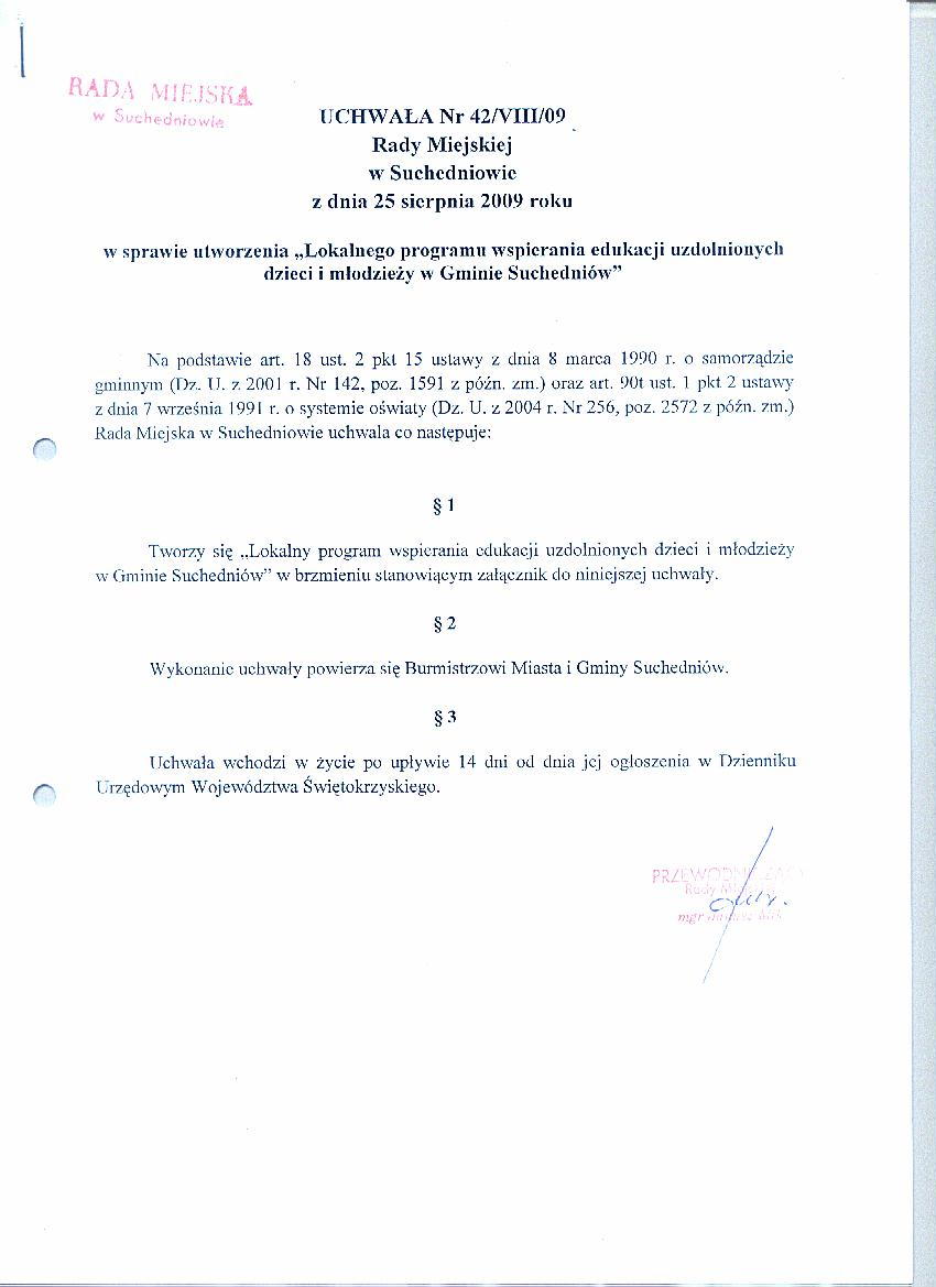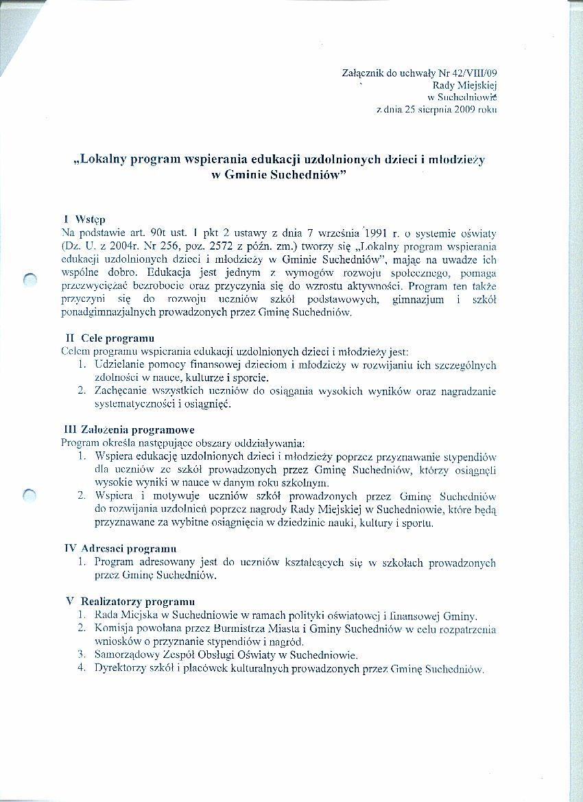 Uchwała Nr 42/VIII/09 - w sprawie Lokalnego Programu Wspierania Edukacji uzdolnionych dzieci i młodzieży