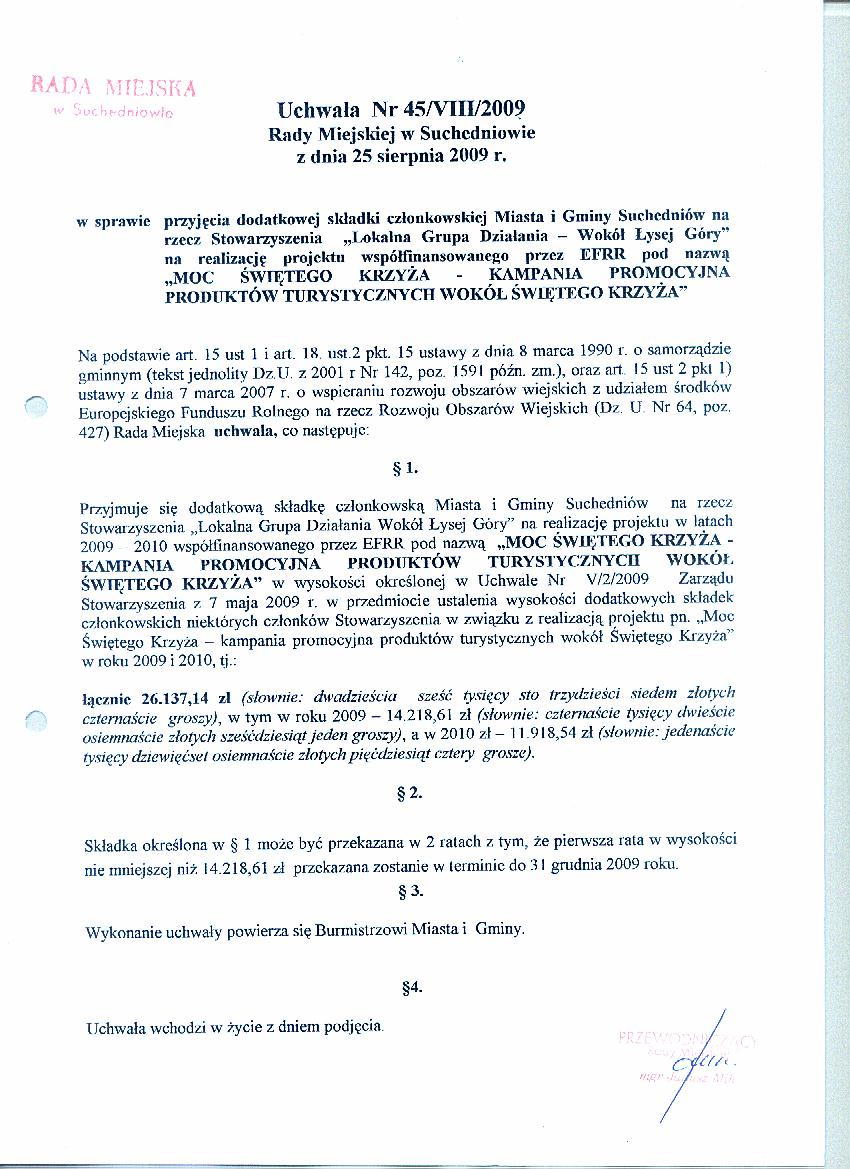 Uchwała Nr 45/VIII/09 - w sprawie przyjęcia dodatkowej składki członkowskiej Miasta i Gminy Suchedniów na rzecz Stowarzyszenia 'Lokalna Grupa Działania - Wokół Łysej Góry' na realizację projektu współfinansowanego przez EFRR pod nazwą 'MOC ŚWIĘTEGO KRZYŻA - KAMPANIA PROMOCYJNA PRODUKTÓW TURYSTYCZNYCH WOKÓŁ ŚWIĘTEGO KRZYŻA'0